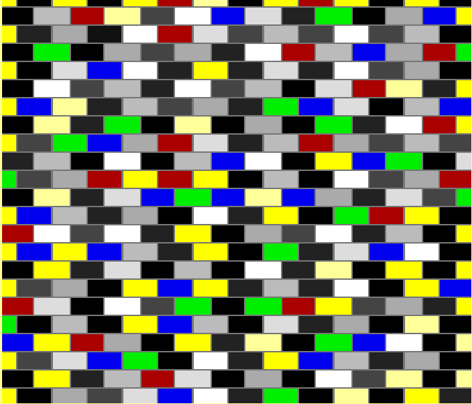 Since the Cafe Wall illusion is intensity, not color, dependent, we can assign random colors to its bricks, as long as the resulting brick luminance does not bring the brick to the other side of the general mortar luminance. This allows disruption of the visual cues which give the standard form of the illusion a certain sense of geometric regularity. This makes it much easier to misperceive the figure's topology, and to develop a perception in which the horizontal lines seem to be crossing somewhere just out of one's field of view. The following figure shows such a 'motley' wall.