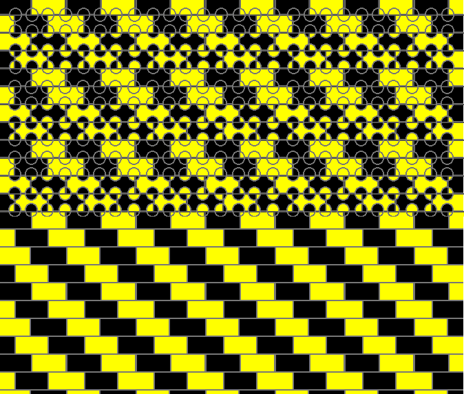 "When the tiles are displaced by half a tile width in alternate rows, the locking across the mortar only occurs where half a light tile faces half a dark tile (b in the figure). Where the light halves face, and where the dark halves face, the locking will not be across the mortar, but only on their own tileŅmortar borders (a and c in the figure). There are therefore different locking signals along the length of each bright and dark tile, producing wedge-like distortion of the tiles."