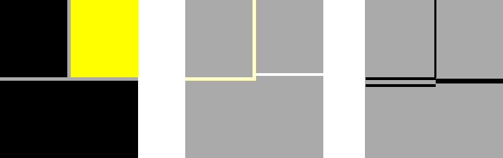 This observation,and the preceding discussion, suggest the following explanation for the tendency of the T-junctions to create a local slant percept. Consider the light-dots image, which is obtained by representing the average background luminance as grey, and brightening every pixel darker than this until it becomes this background grey. In this transformed image, the black-to yellow T-junction seen at the left of the following figure will appear in the light-dots (resp. dark-dots) image in the transformed version shown in the middle (resp.on the right) of the following figure. Note that the light-dots image contains a 'step' from which an appropriate slant micro-percept could develop. The same is true, mutis mutandis, at junctions where two bright and one dark rectangles meet.