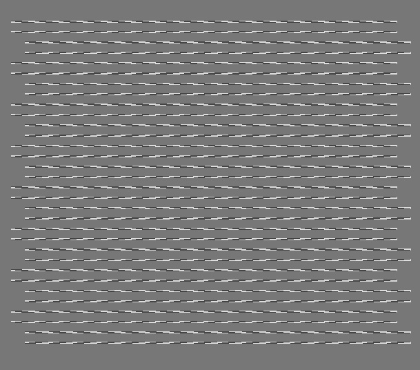 An obvious theory can be offered for the illusion of slope that appears in these figures. The horizontal lines seen contain obvious sloping elements. In the theory being explored in the present series of papers, these will cause a strong reaction in the visual map which detects slope at the angle of these elements, and so will appear as 'bright spots' in this 'slope image'. When this map is combined, in preparation for the integration of internal visual system lines, with the simultaneously present intensity image, in which the horizontal lines in the Fraser image appears without breaks, it will be found that this second image is in register with a slant mage not too far distant from it in overall slope. Since this is standard evidence for the presence of a slanted line, a slanted line percept will be generated.