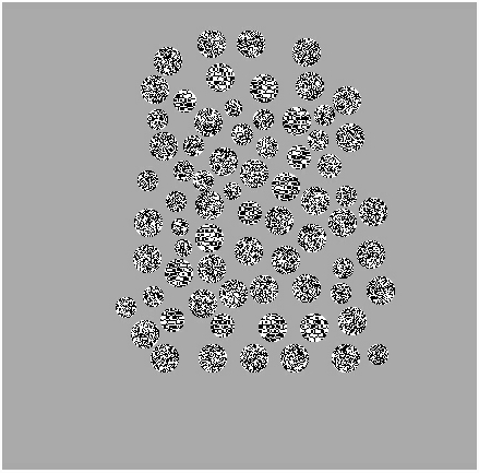 The fact that conjunctive gestalts are not perceptible is further confirmed by the following figure, which renders our standard '2' gestalt in three ways: (i) as those dots which are both darkened and internally moving, in a field of dots others of which are either dark or moving but not both; (ii) as those dots which darkened in a field otheres of which are moving; (iii) as those dots which moving in a field others of which are darkened. The gestalt is plainly visible in cases (ii) and (iii), but imperceptible in case (i).