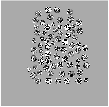 We begin with a standard red-green colorblindness test. This figure represents the form of a large '2' in green dots, surrounded by a red-dot background. The intensity of the dots is varied randomly so as to leave color as the only clue to the gestalt's presence. The ordinary ged-green colorblind person (the author of these papers is one such) will be able to identify each of the green dots and distinguish them from the red. However,in the visual system of a colorblind person the perceptual saliency of the red-green distinction is sufficiently reduced for formation of the gestalt to form, and no numeral is seen. (Believe me - I can't see it at all.)