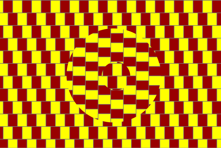 When a patch of the Cafe Wall pattern is turned 90o from the patten surrounding it, a curious slight percept of motion develop. As can be seen here, the patch seems occasionally to drift slightly relative to its background. The 'devil's eye' figure seen later in this collection shows the same effect in a more active setting derived from a 'gradient' version of the Cafe Wall Illusion.