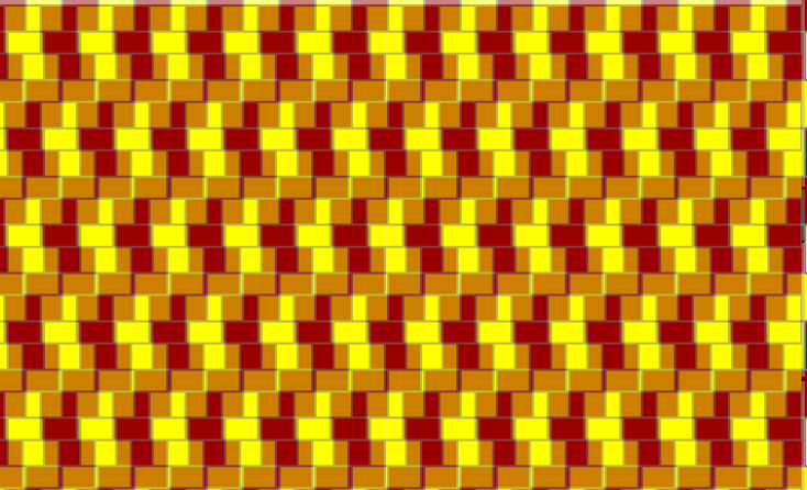 The boundaries of the slanted left and right 'escalators' and the 'wedges' in this curious variant of the Cafe Wall Illusion are all perfectly horizontal, demonstrating the strength of the illusion and its tie to local image details.